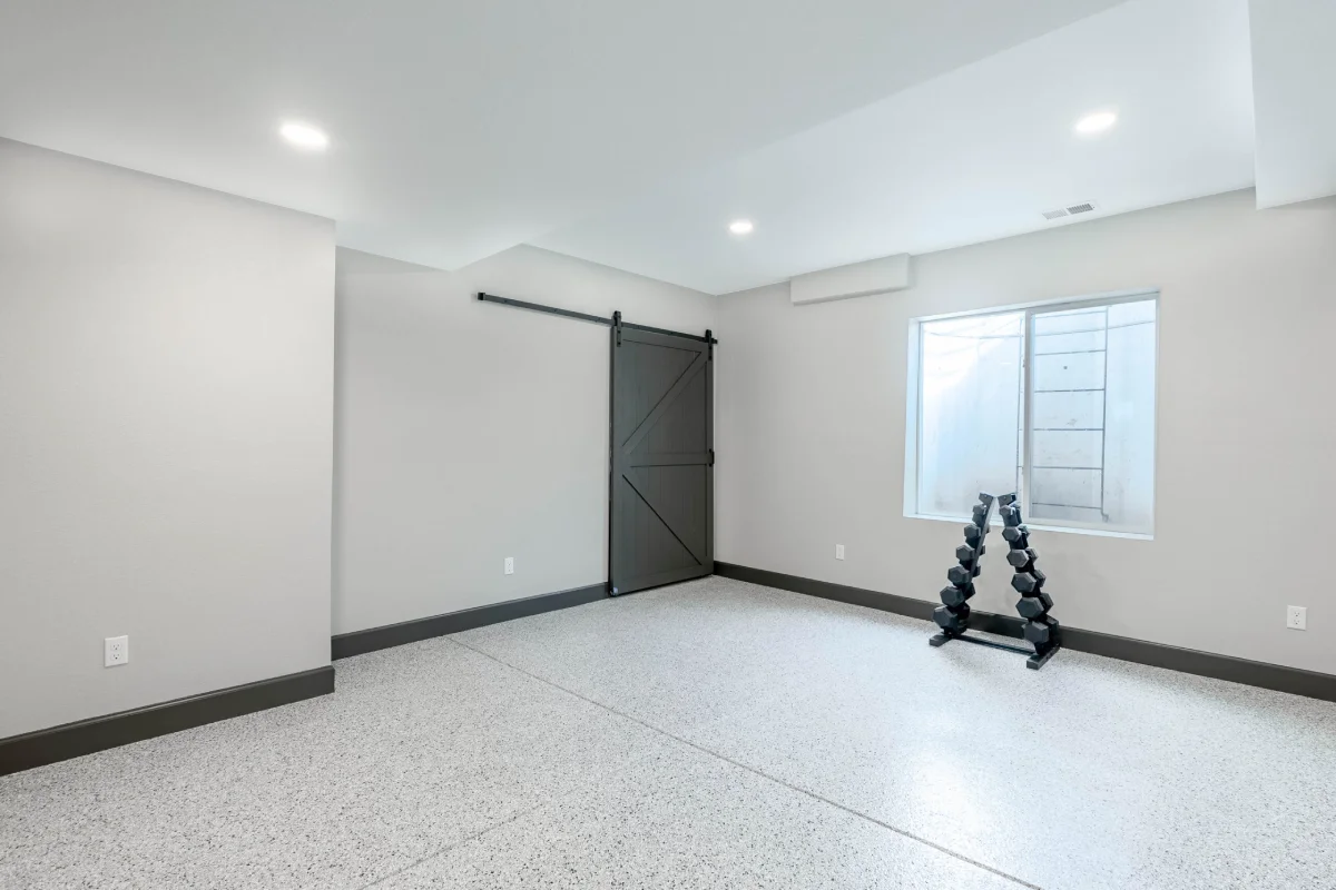 The gym area, featuring the durable epoxy floor and upgraded lighting, provides a clean, safe, and motivating space for daily workouts.