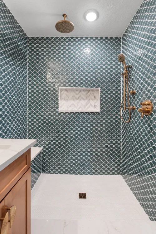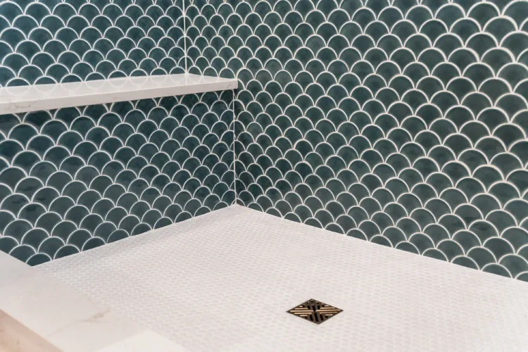 The shower features a stunning “fish scale” or scallop pattern using Tortona in Fog Grey Crackle tile.