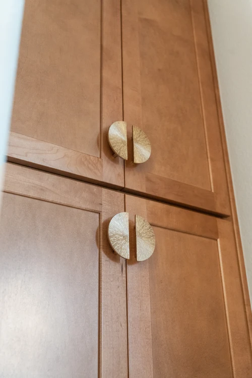 This matches the custom semi-circle cabinet hardware and the mid-century modern sconces.