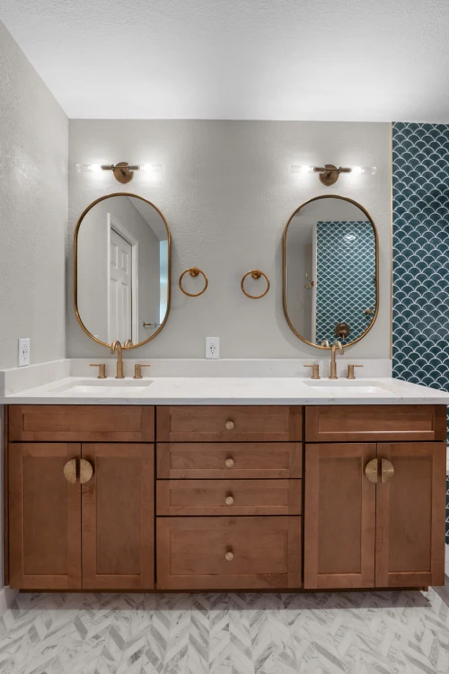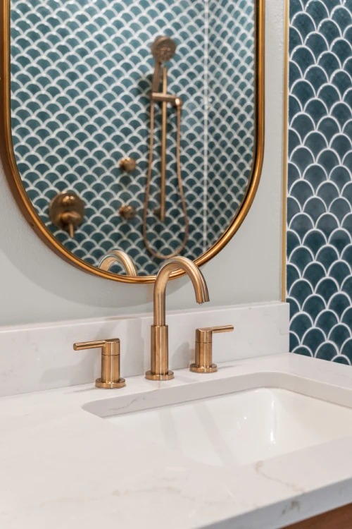 The highlight of this renovation is the spa-inspired bathroom featuring a bold, aquatic-themed tile design, paired with warm wood tones and luxury gold finishes.