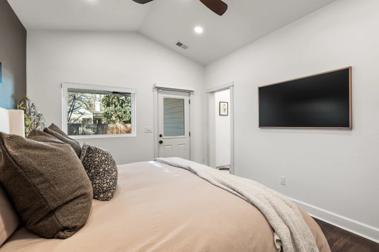 Inside, the bedroom feels open and bright, with vaulted ceiling lines, recessed lighting, and a ceiling fan for comfortable airflow.